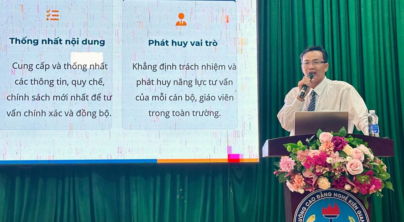 Thông qua buổi tập huấn, toàn thể viên chức, giáo viên đã được cập nhật đầy đủ các nội dung tuyển sinh năm học 2026–2027, thống nhất phương thức tư vấn trực tiếp cho học sinh cuối cấp THCS, THPT và tăng cường phối hợp trong công tác truyền thông tuyển sinh. Đây là hoạt động quan trọng nhằm nâng cao hiệu quả công tác tuyển sinh, đồng thời khẳng định quyết tâm của Trường Cao đẳng nghề Kiên Giang trong việc phát triển quy mô đào tạo, đáp ứng nhu cầu nguồn nhân lực chất lượng cho địa phương và xã hội.