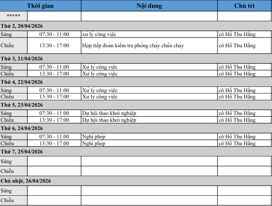 LỊCH LÀM VIỆC CỦA BAN GIÁM HIỆU TỪ NGÀY 20/4/2026- 26/4/2026