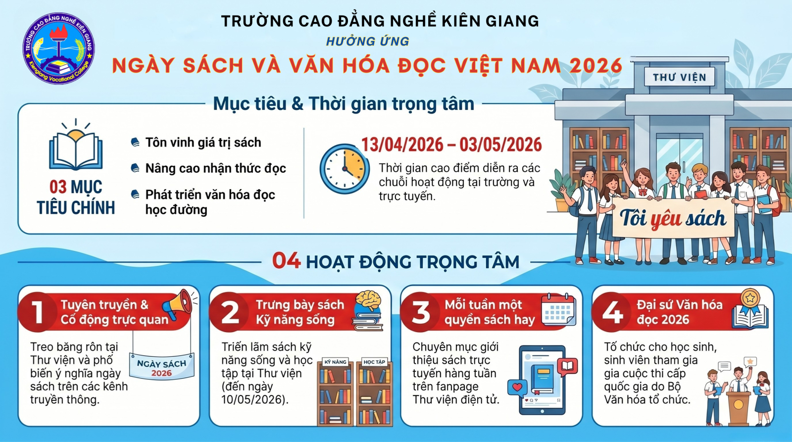 Nhận thức rõ điều đó, Trường Cao đẳng Nghề Kiên Giang đã triển khai nhiều hoạt động cụ thể, thiết thực nhằm khuyến khích thói quen đọc trong học sinh, sinh viên: tổ chức trưng bày và giới thiệu sách tại thư viện; xây dựng chuyên đề “Mỗi tuần một quyển sách hay” trên nền tảng trực tuyến; phát động phong trào hưởng ứng tham gia Cuộc thi Đại sứ Văn hóa đọc năm 2026 do Thư viện Tỉnh An Giang tổ chức. Những hoạt động này không chỉ tạo điều kiện tiếp cận sách mà còn góp phần hình thành môi trường học tập tích cực, nơi việc đọc trở thành một phần tự nhiên trong đời sống học đường.